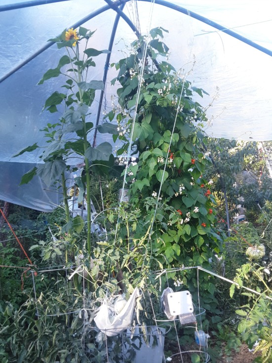 Got plastic up over the tomatoes. They've been outdoors up until now. Sunflower and beans are both up at 13' which is the height of the metal trusses. Put fans on the tomatoes a couple weeks ago. I don't know if its necessary or helpful but I am just blindly following Mr. Sutherland on this. I'm not into being a sheep about everything... but maybe its worth a try.