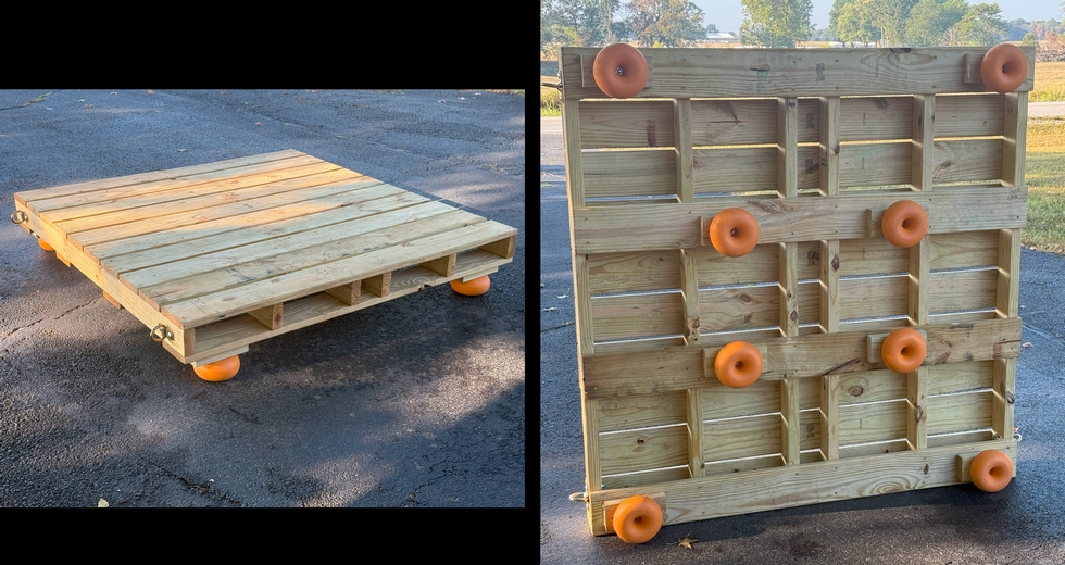 Transport pallet with tiedowns. I added 8 pallet cushions for a weight rating between 1000 and 1800 pounds, (hopefully I will have to add some more next year). Just need to add some foam on the top to finish it off.