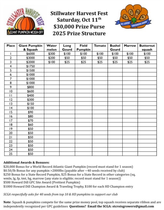 Stillwater Harvestfest will be once again held in Lowell Park on the bank of the St. Croix River. If you are an SCGA member for the 2025 growing season, your fruit registration fee is covered. If you are not a member, you can purchase a SCGA membership here. You can also register on the day of the weighoff, $20 per entrant.