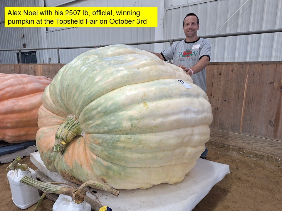 The official winning pumpkin at the Topsfield Fair was Alex Noel, with his 2507 pounder that went 21% over the new GPC Chart. Impressive and CONGRATS Alex!