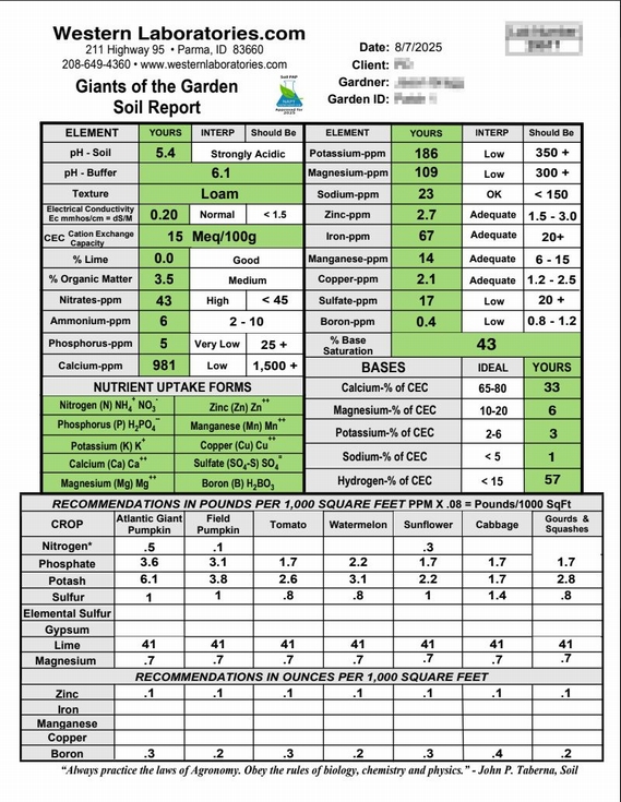 So here are copies of the two soil tests that I had run in August 2025. Looks like the big things that I needed to work on right away are the soil pH, Calcium, and Organic Matter. Those are what I'm working on this fall, so they have time to kick in by spring... I should note this patch has never been amended before, and just barley grown in for a couple months this summer...