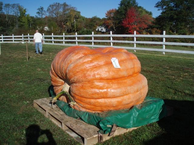 Steve Connolly's monster grown on the 1566 Rodonis 2007 and crossed with the 1689 Jutras 2007. Unforunately, this pumpkin had a small hole deep within a rib on the bottom and was leaking on the day of the weigh-off.