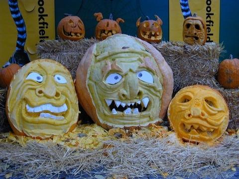 thre giant pumpkins weighting from 500 to 200 pounds this was carved by steve dahlke