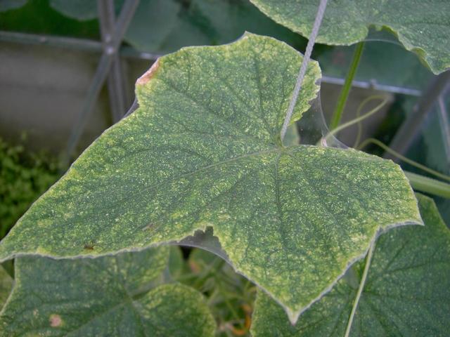 I am pretty sure that this damage on my greenhouse cucumber plants is caused by spider mites.