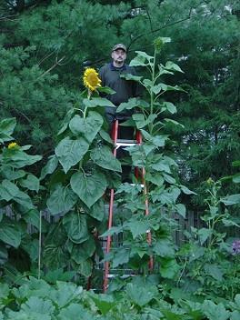 On my left is a 12 foot Ripley's Believe It or Not - Giant Sunflower. On my right is a 14 foot Bott's Strain Mammoth Russian. More pictures of my sunflowers on my webpage: http://wwww.geocities.com/sunflower_info/