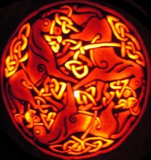 I had originally carved on this on a 36 pound pumpkin. Unfortunately, it fell victim to my "Pumpkin Dunkin'" experiments and was reduced to mush. Recarved as pictured here on a smaller 20 pound pumpkin.