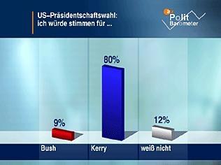 If Germans were to vote the US President the result would look like shown in the picture: 80% Kerry, 9% Bush and 12% unsure. The poll was done by the "Forschungsgruppe Wahlen" (one of Germany's leading opinion research institutes), over 1500 randomly selected citizens were asked and the result was published in the "Politbarometer".