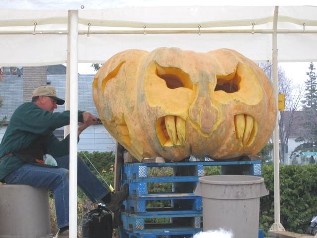 Scott Cully from Oregon carving Al Eaton's new world record pumpkin weighing in at 1446 pounds. Al Eaton is from Richmond, Ontario.