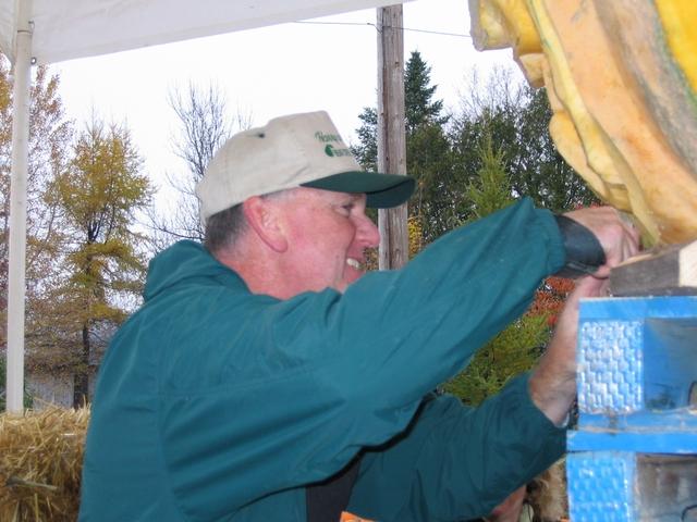 Scott Cully carving Al Eaton's pumpkin (1446 pounds)in Richmond, Ontario