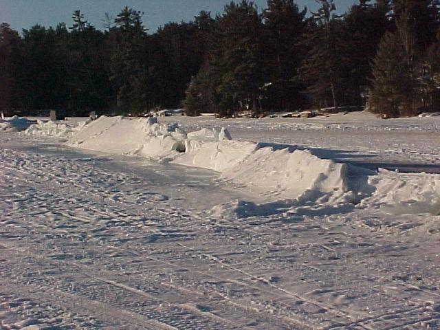 for you folks who dont know what a pressure ridge is. this is a ridge in the ice caused by the ice expanding and freezing some a worse then others and they do creep daily,like a dam in the winter these are good places to avoid if possible,this one was 40 ft off shore and had to be delt with ,scores of vechicles traveled over the entrance area including myself, its always a bit scary driving on ice as it settle cracks as you drive even if theres 3 ft of ice, there was only 15" this year. this all happend friday night.
