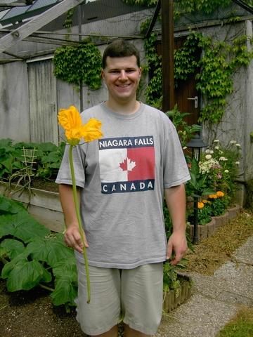 Just thought I'd show you a picture of an average male flower my 801.5 Stelts plant is producing. Just like last year this plant is again the most vigorous plant in my patch by far. Everything is bigger than normal, the vines are very thick (MV diameter up to 2"), leaves up to 36" across and huge male and female flowers. I can only hope that the resulting fruit will also have such dimensions! If so it will be scary :-) Seems like the plant knows how much I like it and responds to it.