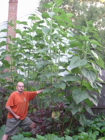 They are getting close to flowering. Some Bott's are over 13 feet tall. The Ripley's Giant Sunflower is about 10 feet tall. Should hopefully get some Bott's to about 14 feet. Marrow plant below still hasn't produce a single marrow. Marrow plant wrapped all way around the sunflower row and is making it's second trip around.