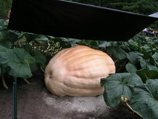 This is a side-view of Fred Macari's smaller pumpkin growing on his 1173 seed.