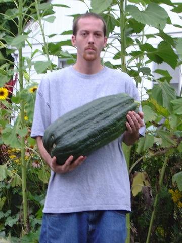 Neighbor, Jonny 5, with his 15 pound english vegetable marrow. This was his first try at gardening.