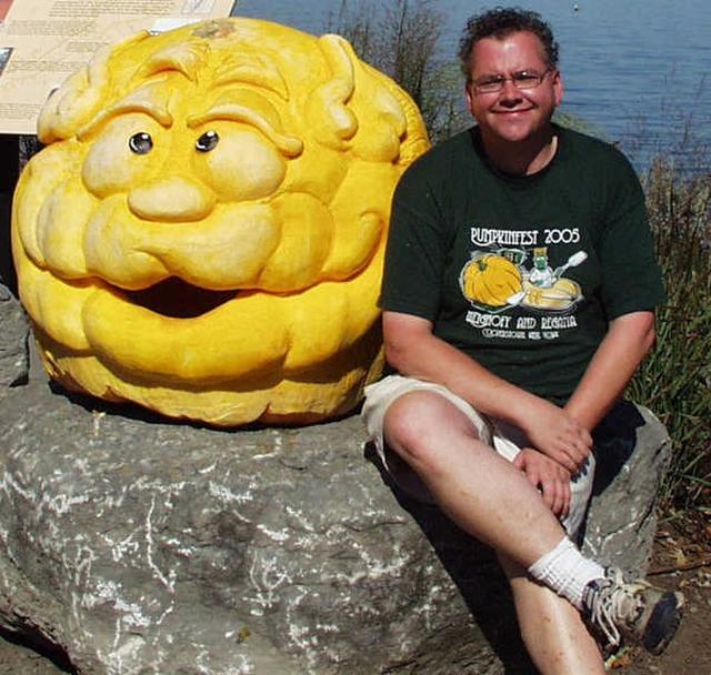 Oswald Jr. weighed 454 pounds and over two and a half days I shaved some 60 pounds away in 19 hours of carving time. Visit all the Grumpkins at: http://www.grumpkins.com