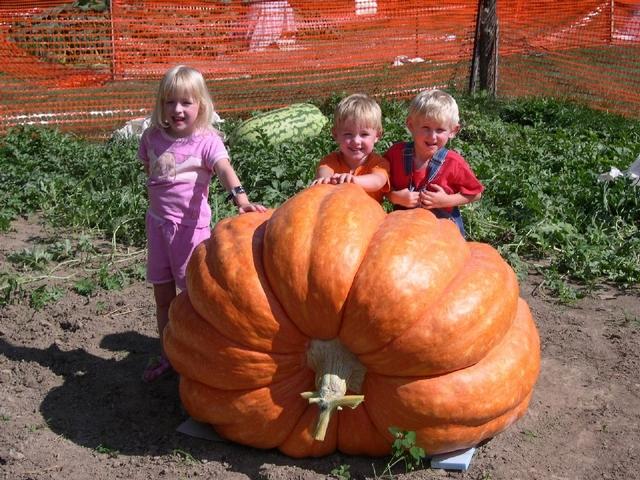 Heres my kids showing off the 555Crosby05 Dmg ( 869.5Calai X 1109Speakman). This one went down the end of Aug. to Blossum end split. This had the best color of all my pumpkins this year.