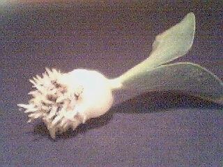This seedling came from a seed from Moe Hunter's 800 from last year. Just below the leaves is a smooth "gob" about the size of a pea. Coming out of the bottom of it is about a gazillion root stubs. I don't know if this is a genetic mutation, or if it happened because I soaked the seed in Schultz's Starter-Plus root stimulator. This happened to two different seeds. A third seed that wasn't soaked at all appears to be germinating properly at this time.