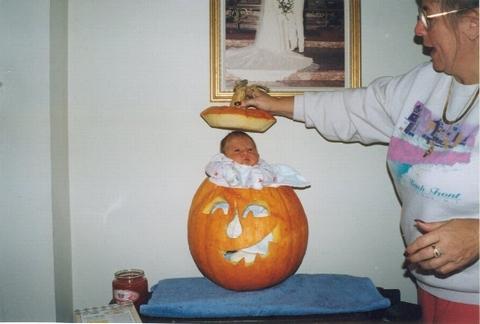 Alex born on October 29th 1998 comes home on halloween. My sister in the pictured delivered Alex. When we got home she immediately swaddled him and got pictures of him in his first pumpkin...