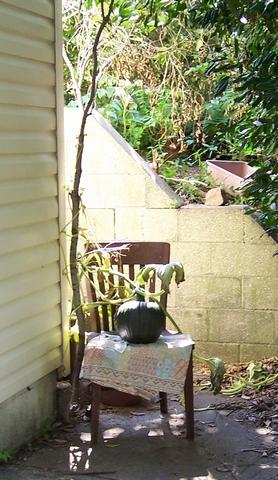My wife, Carolyn has pumpkins growing evreywhere. This one she put on an old chair and let the vine grow up a tree branch and into a tree.