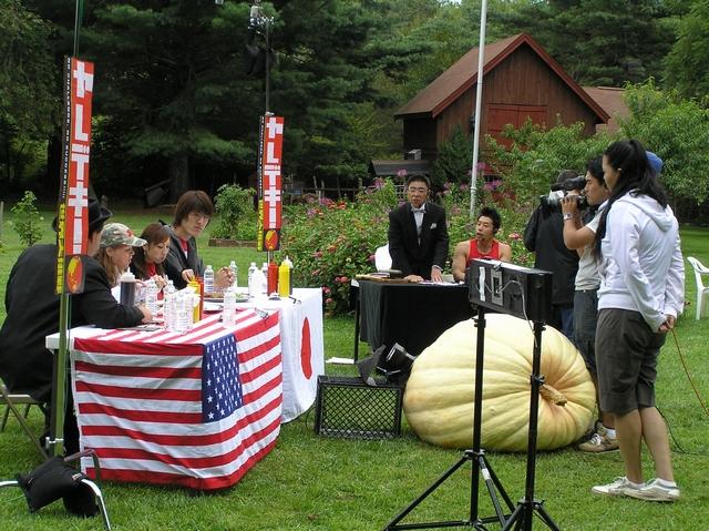 3 Giant Pumpkins were provided to the Japanese TV station for the Giant Pumpkin Eating Contest, at the Wallaces Patch on August 21, 2007. Here the contestants are told the rules.