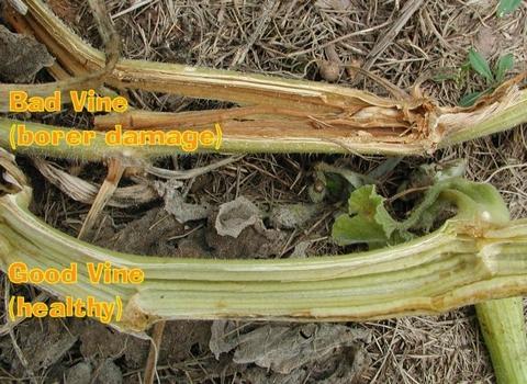The top vine is a cutaway that has been invested by Squash Vine Borers. The bottom vine is a cutaway of a healthy vine.