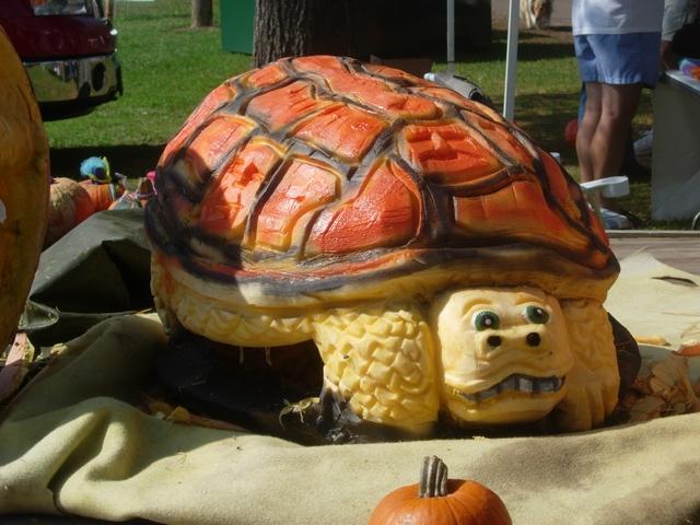 this was carved on saturday at the nekoosa pumpkin weigh off this turtle took 4 hours to carve and added some color to make it pop