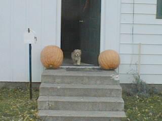 Last years Pumpkins 67#'s on the left and 56#'s on the right and Our new cocker, Freckles in the middle.