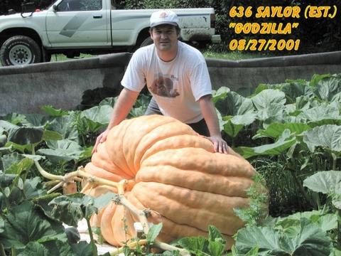 This is GODZILLA. It measured 146" CIR. & 316" OTT, estimated weight was 636 lbs. At day 71 of growth, it split across a groundhog wound, where the wall of the pumpkin was only an inch thick.