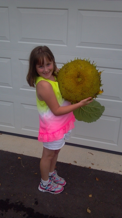 One of my twin 7 year old daughters holding the sunflower head from the self-sown sunflower with the 11 inch stalk. The head wasn't as big as I hoped for. It was 17 inches across. We took it to the Hunterdon County Fair and it won first place for the heaviest head at 8 pounds. They weigh them at the fair instead of measuring the diameter.