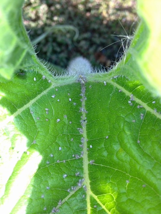 Up close image of sand-like deposits on all leaves of all pumpkin plants in the garden