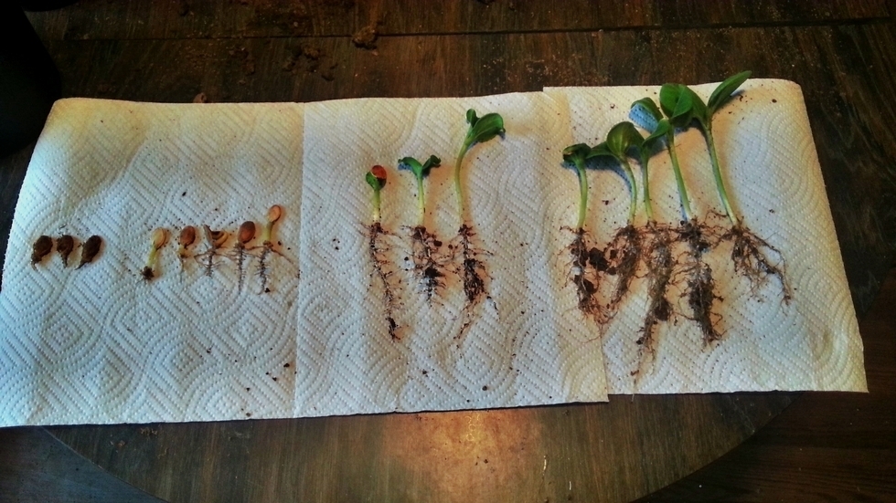 I used 4 soil combos and planted pumpkin seeds from the same package at the same time. These were planted indoors in low light conditions on a heated germination pad. The manure is 5 years old from grass fed cows. This is the result after 12 days.