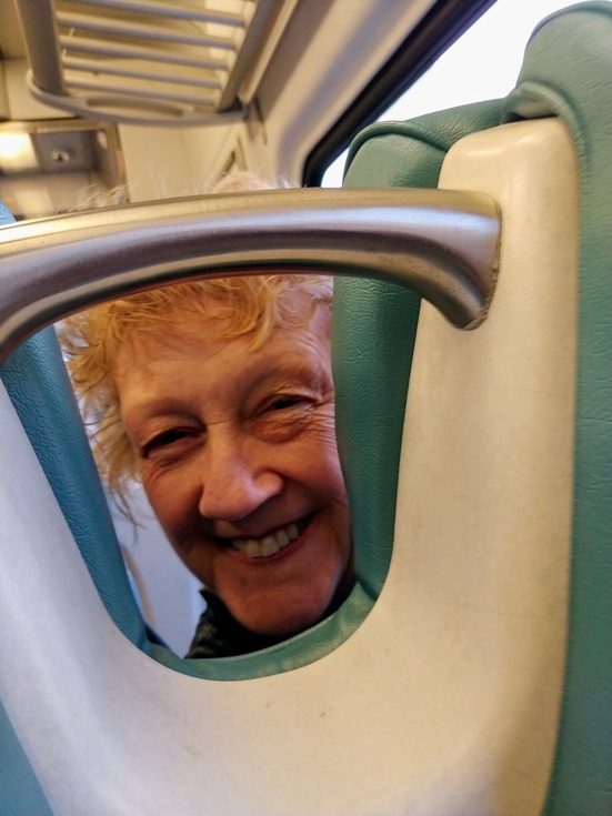 Sue Jutras.... what a beautiful smile and lady.....On board the train to NYBG